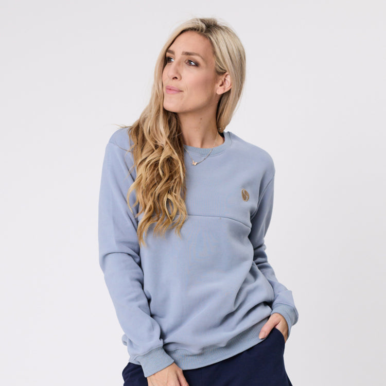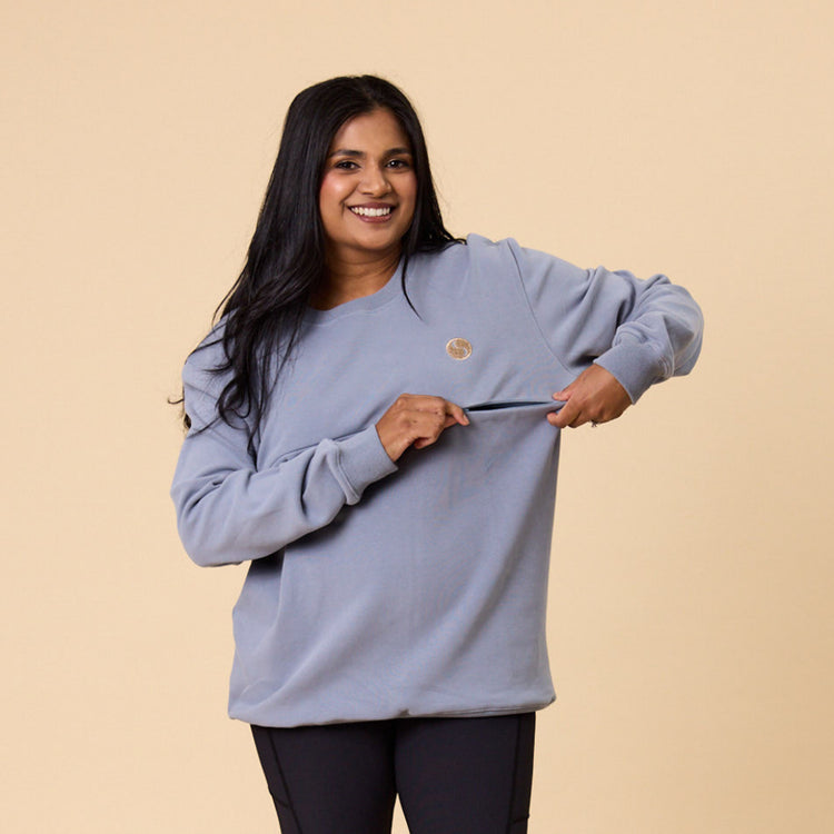 A classic crew neck breastfeeding sweatshirt in an oversized fit will keep you warm and cosy all winter long.
