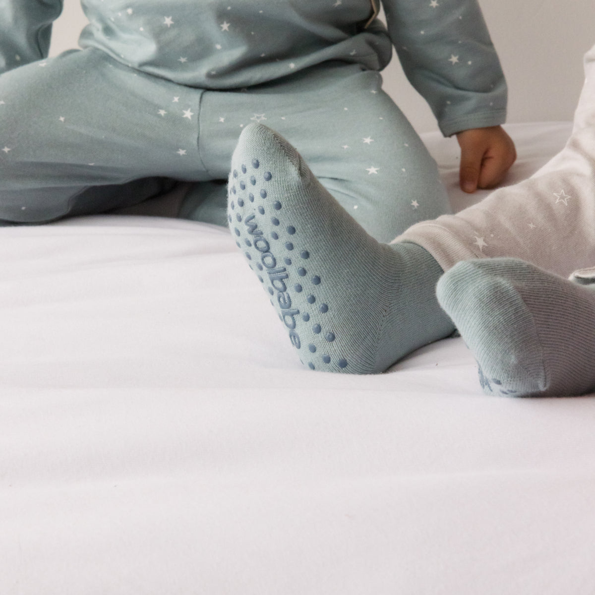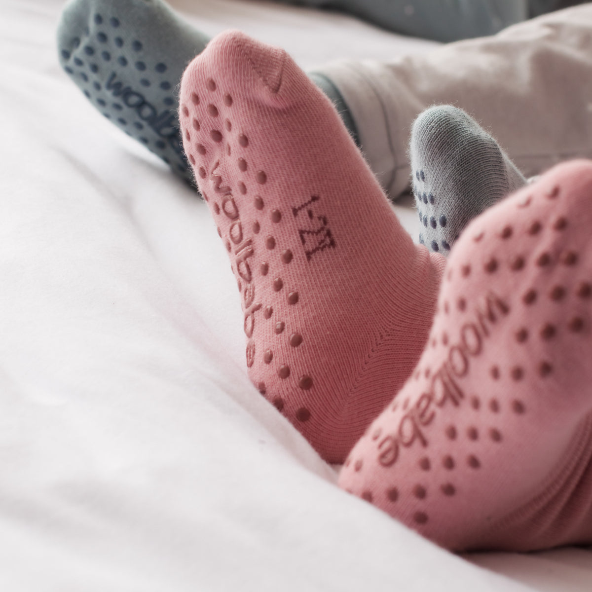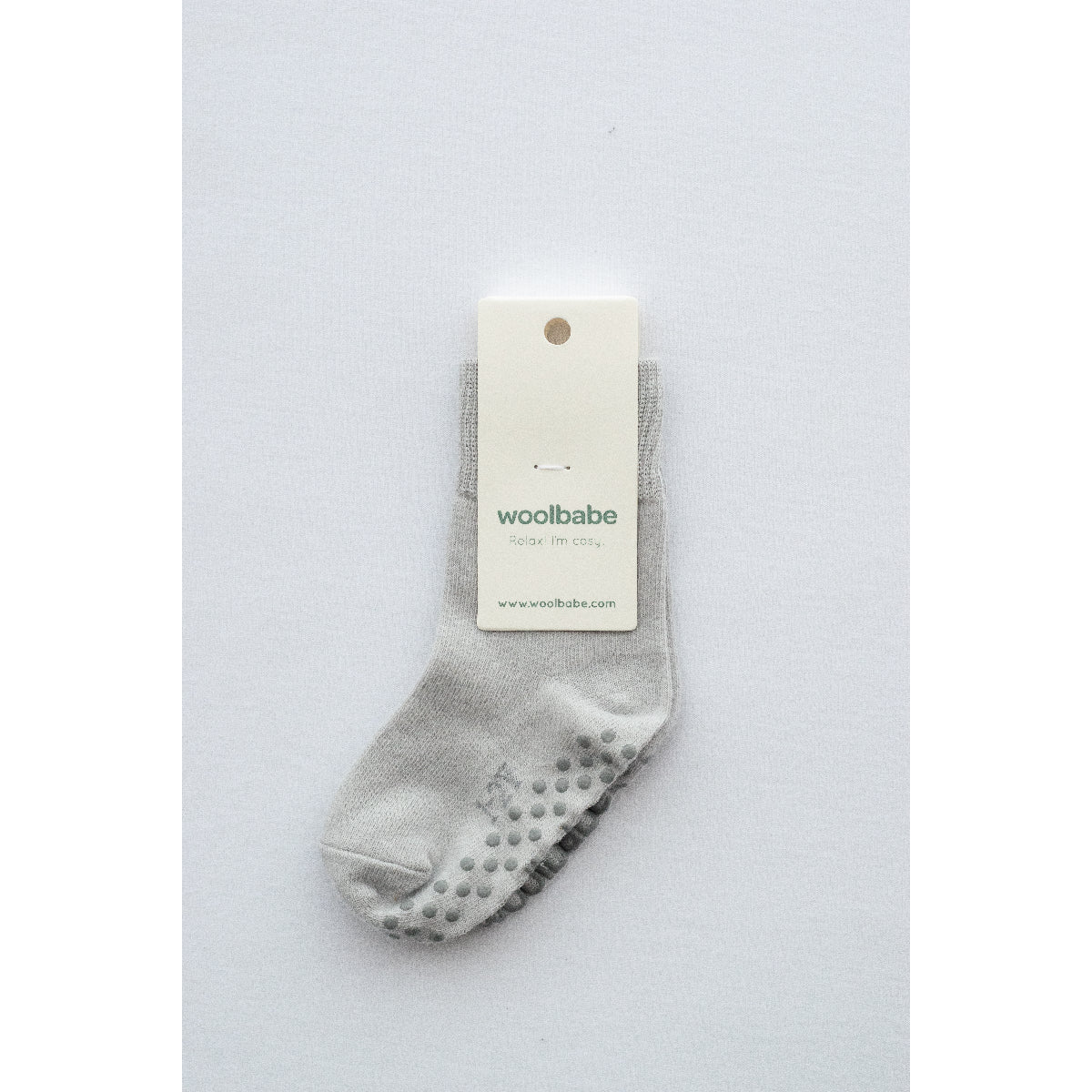 The socks feature printed grip dots and Woolbabe branding on the soles to help prevent slipping on smooth surfaces—ideal for hardwood floors and tiles. (Please note: NB–0-3 months size does not include grip dots, only branding.)