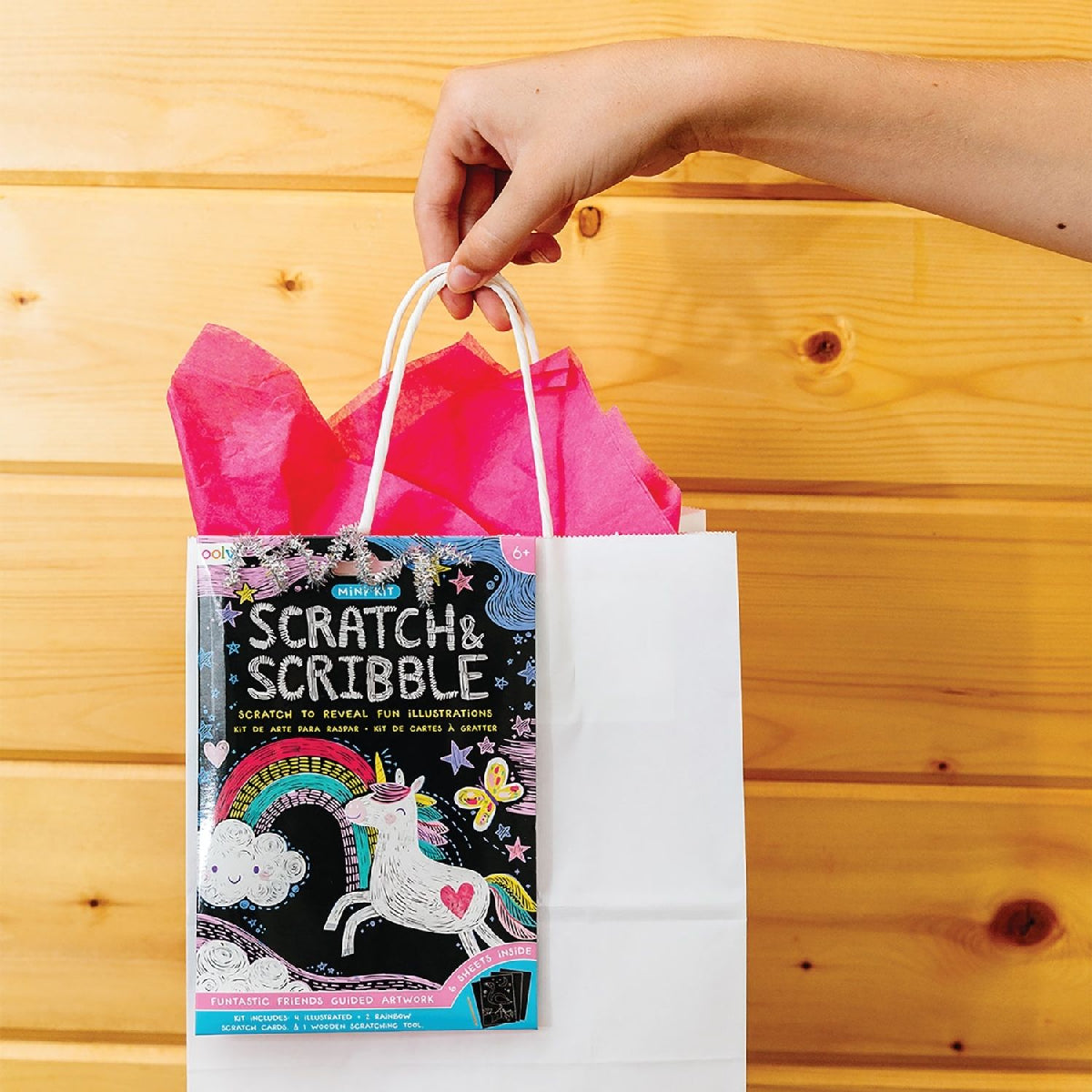 With 4 illustrated scratch cards, 2 rainbow scratch cards, and 1 wooden tool, kids can easily follow guided designs or create their own patterns.