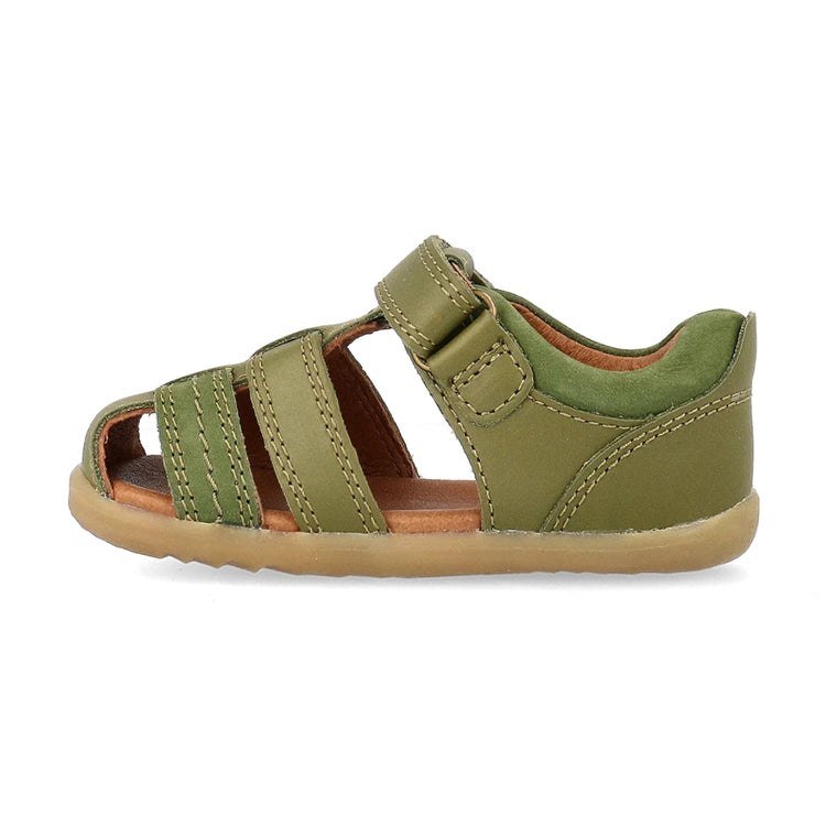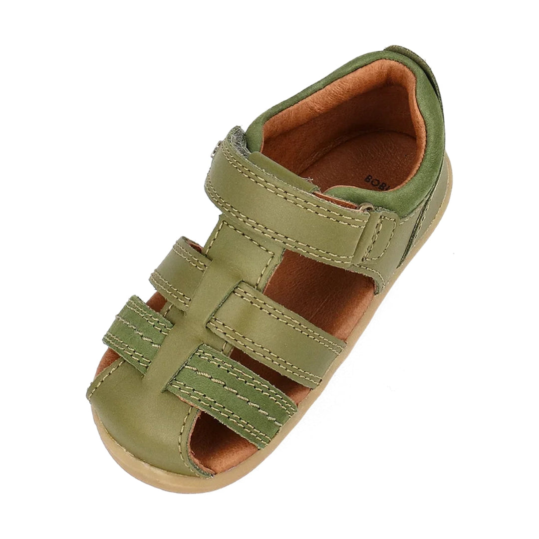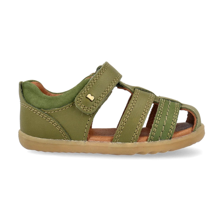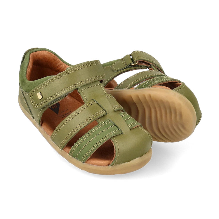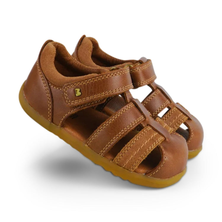 These classic summer sandals have a closed toe for added protection, while open sides provide airflow and breathability. The Roam sandals boast an ankle strap fastening for a secure, adjustable fit, padded collar for comfort and Bobux's signature brass icon rivets add sophistication. Suitable for first walkers, this Step Up style fits average width feet, and is true to size.