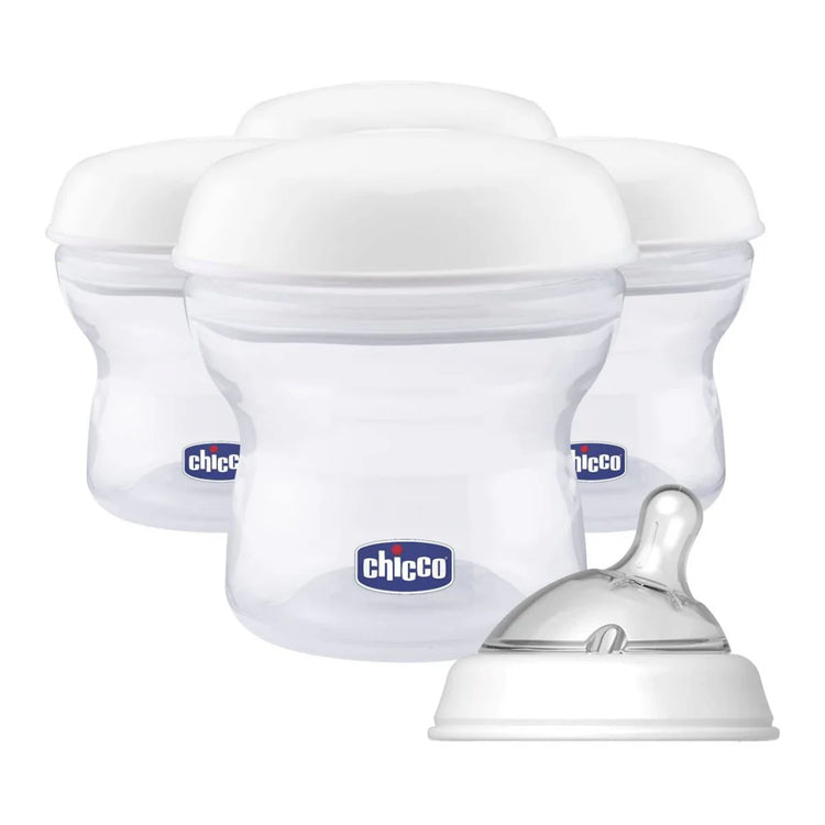 Ideal for storing your excess breast milk, this 4 pack of leakproof containers from the Chicco NaturalFeeling line lets you store milk hygienically in the fridge or freezer. The container is made of light, BPA free, easy to sterilise polypropylene, and the included 0m+ regular flow teat is 100% silicone.