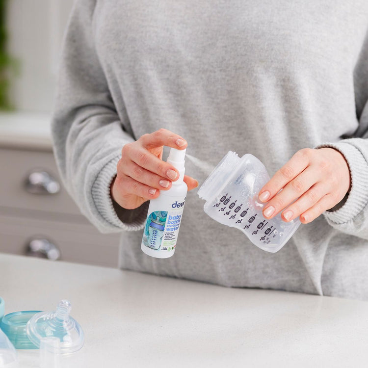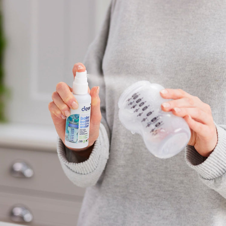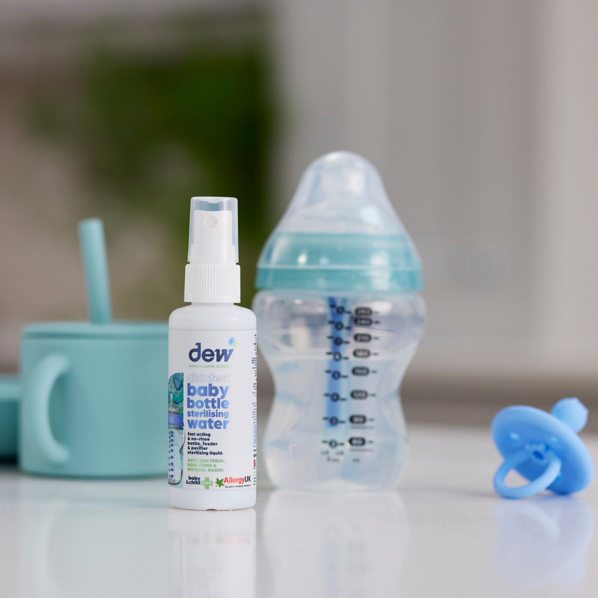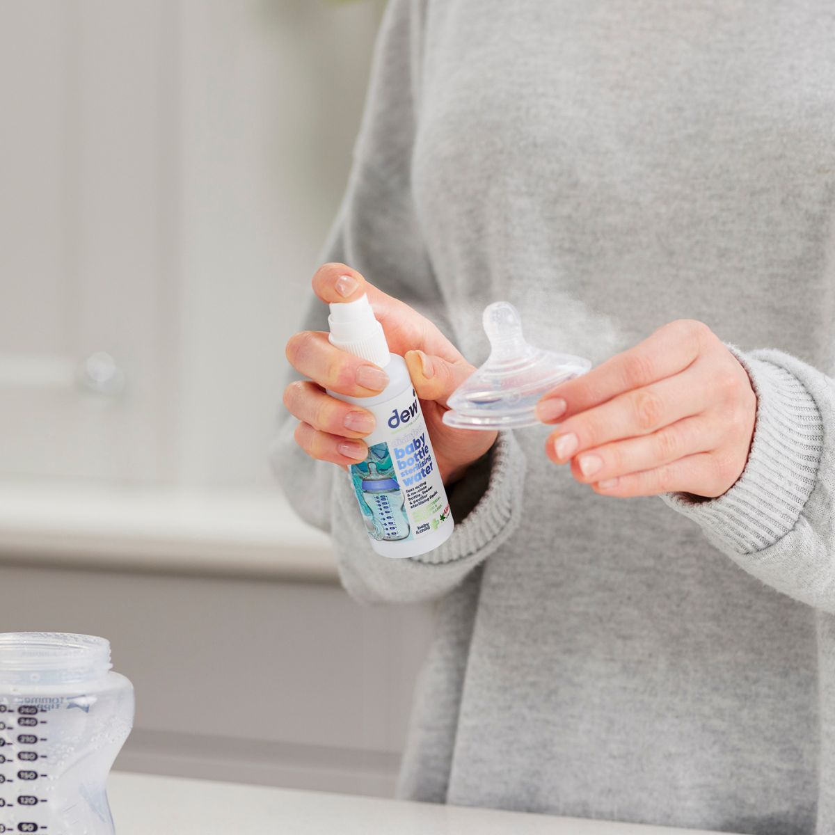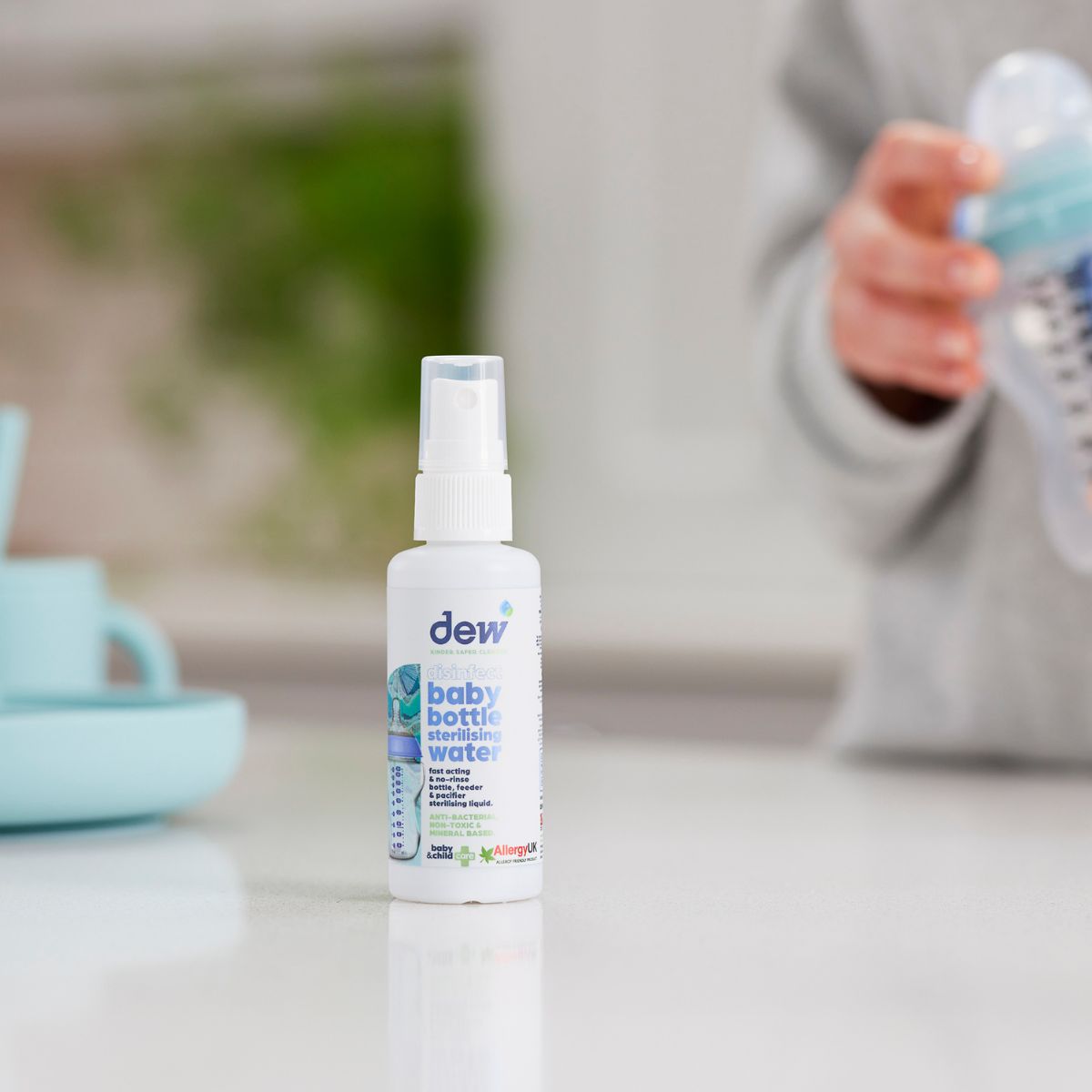 Dew Baby Bottle Sterilising Spray 65ml is ideal for quick, safe sterilisation of bottles, teats, and pacifiers while you're out and about. It kills 99.99% of bacteria with no need to rinse.
