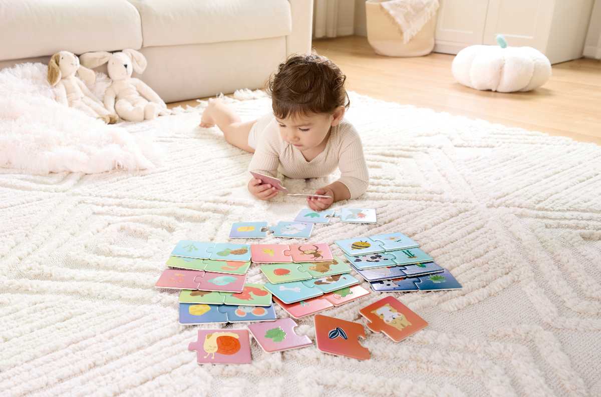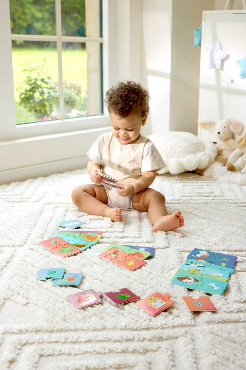 Learn about different animals’ favourite foods in this pair-up puzzle with 36 colourful pieces. As your toddler completes each animal puzzle, ask them to identify and make the noises of the animals. This will help to improve their vocabulary and sound recognition skills.