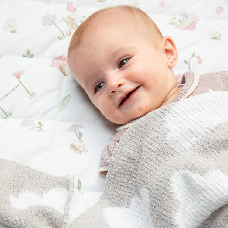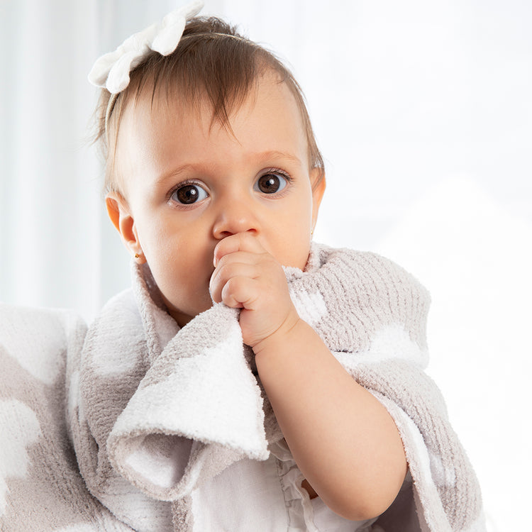 This ultra-soft chenille blanket features a muted grey clouds print, offering both modern style and cosy comfort for your baby.