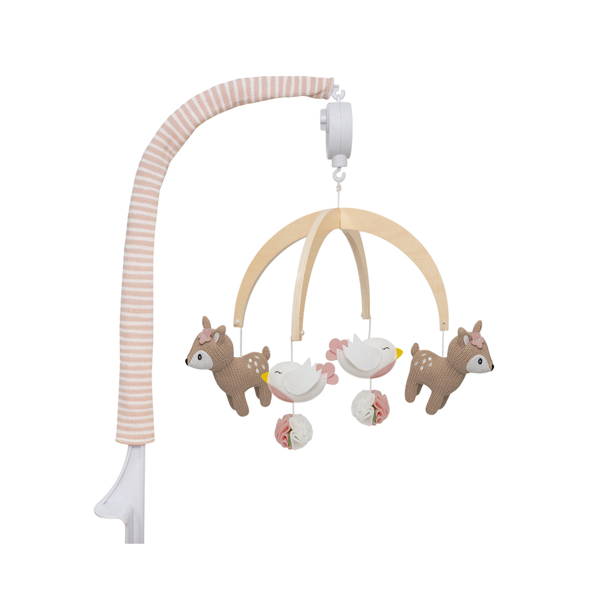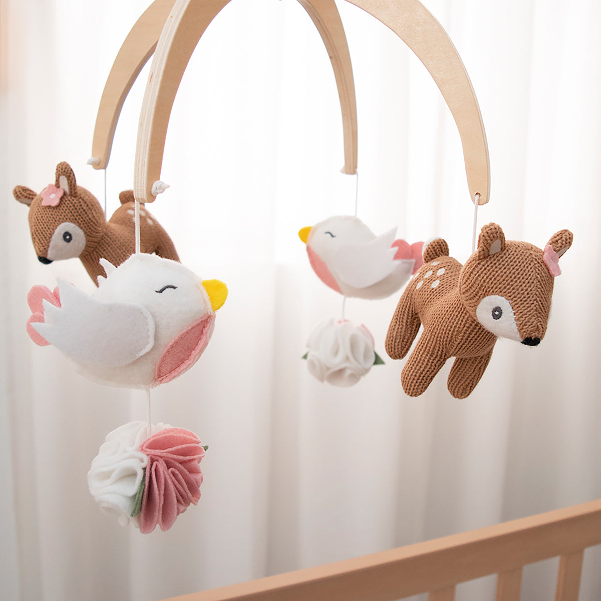 This beautiful musical mobile features sweet baby fawns that gently rotate to Brahms’ Lullaby, creating a soothing bedtime atmosphere.