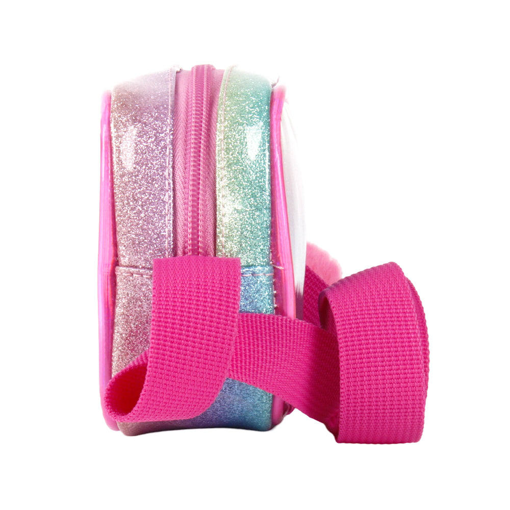 Pink Poppy’s Dreamland Crossbody Bag shines with iridescent rainbow fabric that shimmers and shifts with every step. A bright pink pom pom charm adds a playful touch, making it the perfect accessory for little ones who love a bit of magic in their day.