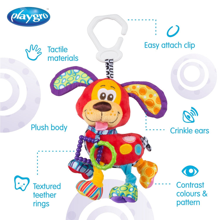 Meet the playful Pookie Puppy! With a range of colours and textures for visual and tactile development. Pooky makes rattles when you move him around, special crinkle sounds in the ears, different textures to explore and hanging click-clack plastic rings. Pookie loves to play with all on the go babies!