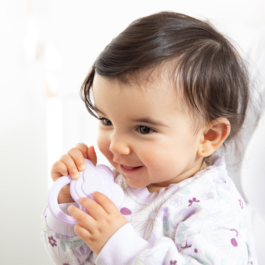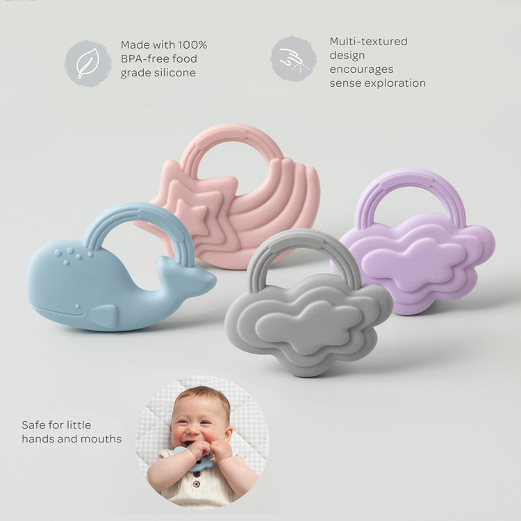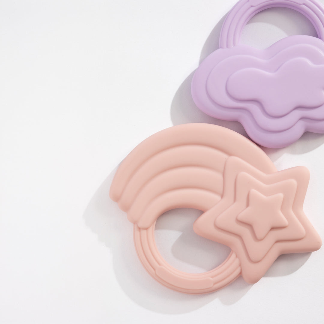 This 2-pack teether set features star and cloud shapes with textured surfaces designed to soothe sore gums and support early sensory exploration.