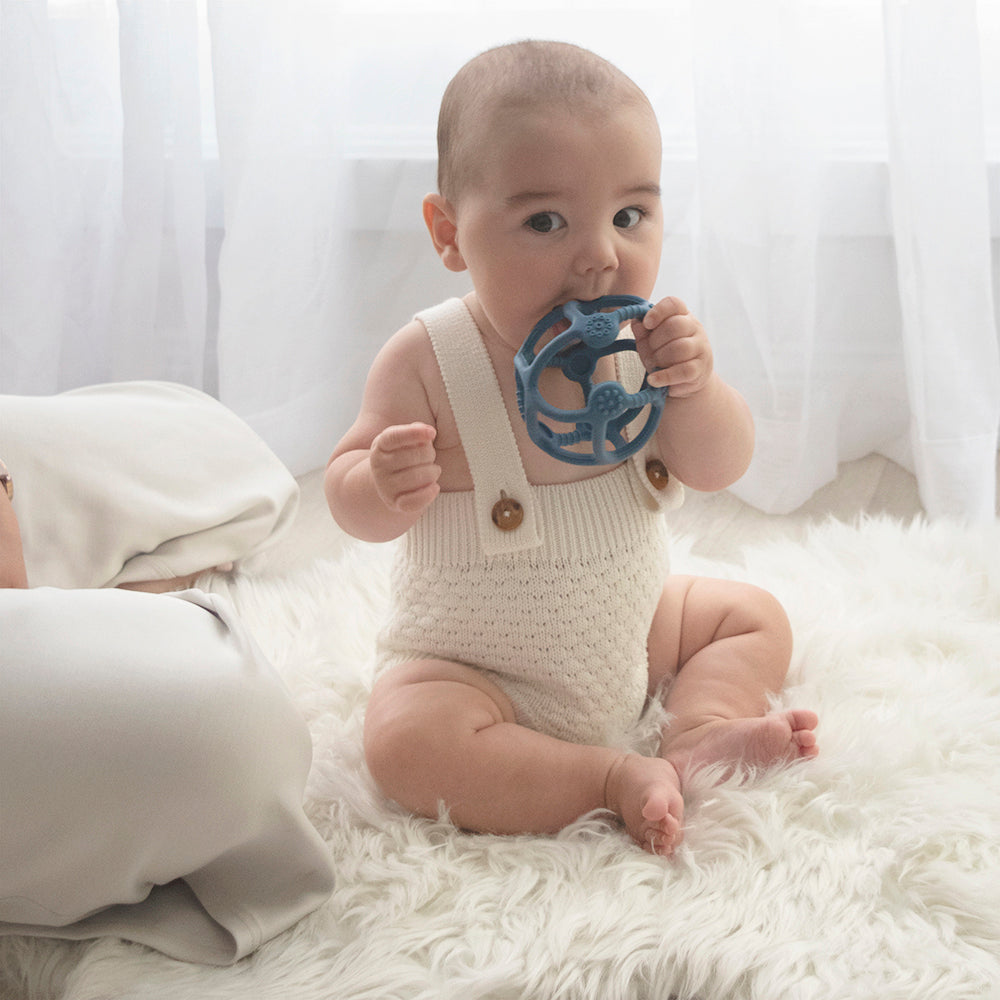This silicone teething ball is designed for little hands to hold and explore, helping soothe sore gums during teething stages.